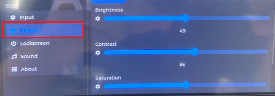在菜单的 Display 一栏中,支持对屏幕的 亮度 (Brightness)、对比度 (Contrast)、饱和度